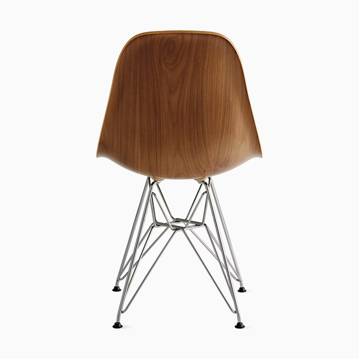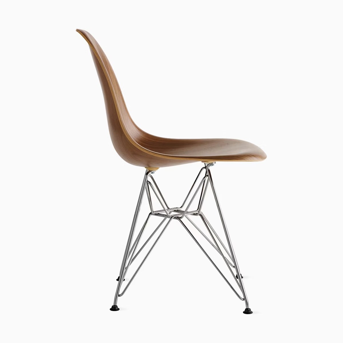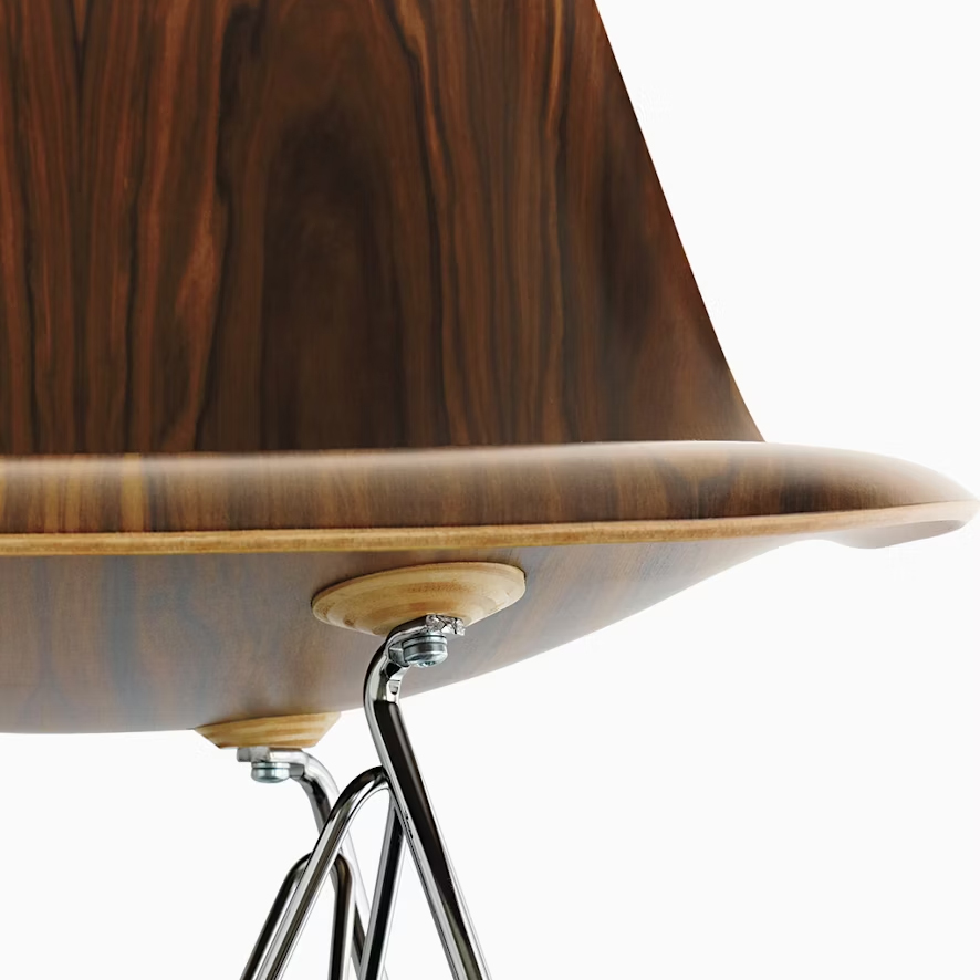 這款餐椅採用 單片模壓結構,邊緣呈瀑布形,厚度為 0.260 吋。椅殼提供四種木質貼面選擇:白蠟木、胡桃木、烏木與檀木,四腳椅架則可選擇鍍鉻、白色或黑色,此外也可選配鐵線椅腳或木棒椅腳。