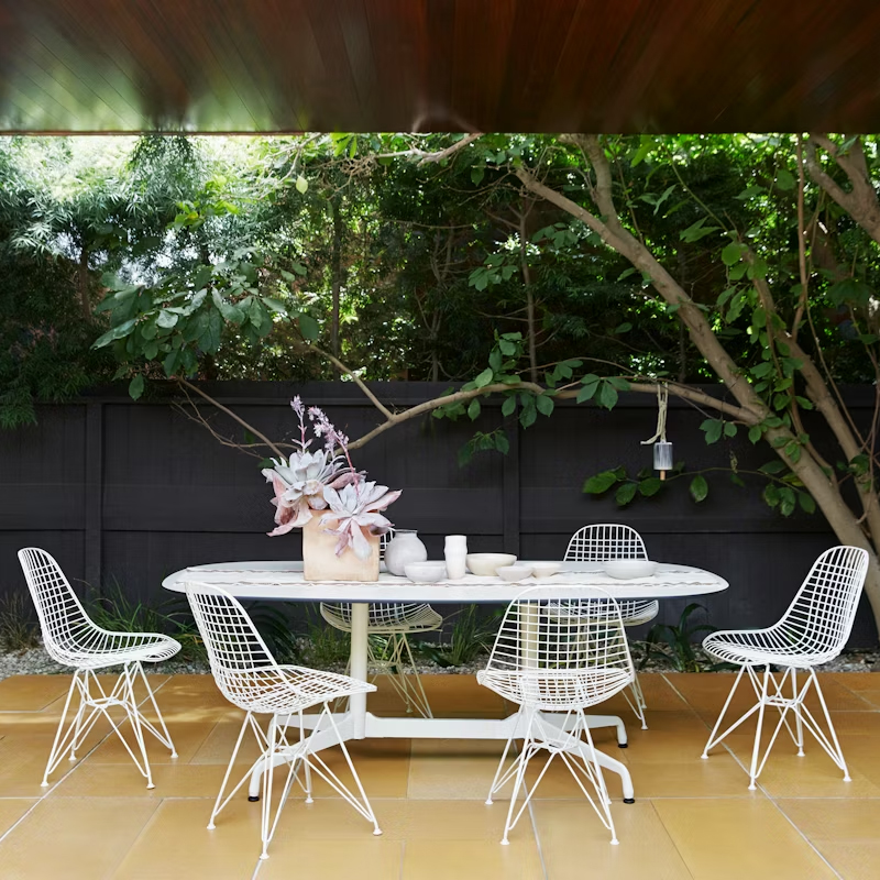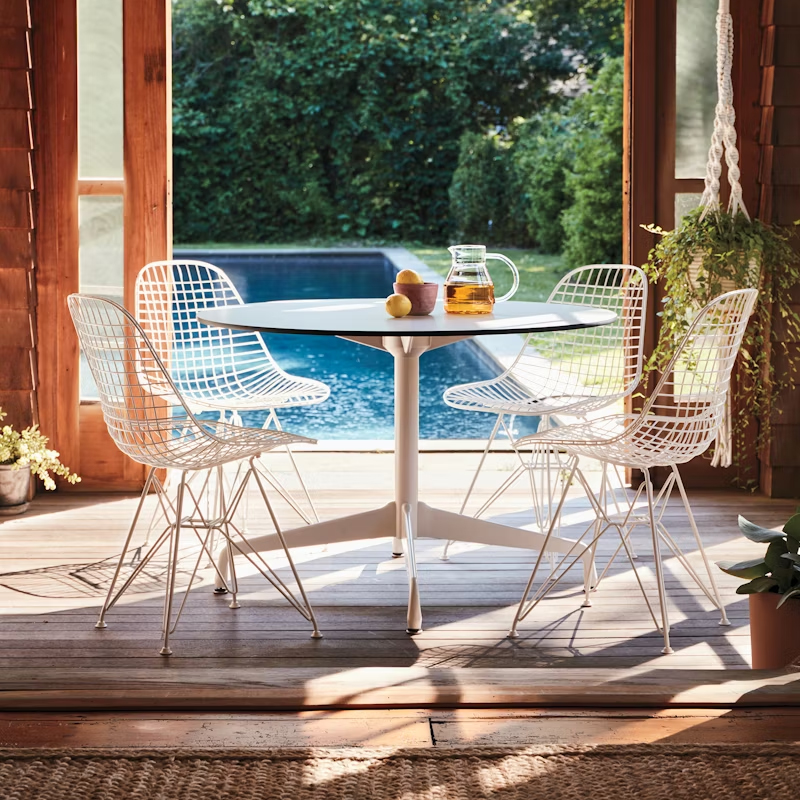 Eames 鐵線椅的輕盈輪廓由交互編織的金屬線材構築,並架於四腳椅架之上,椅子的有機曲線貼合身體線條,使其無論在居家或辦公場所都十分適合。