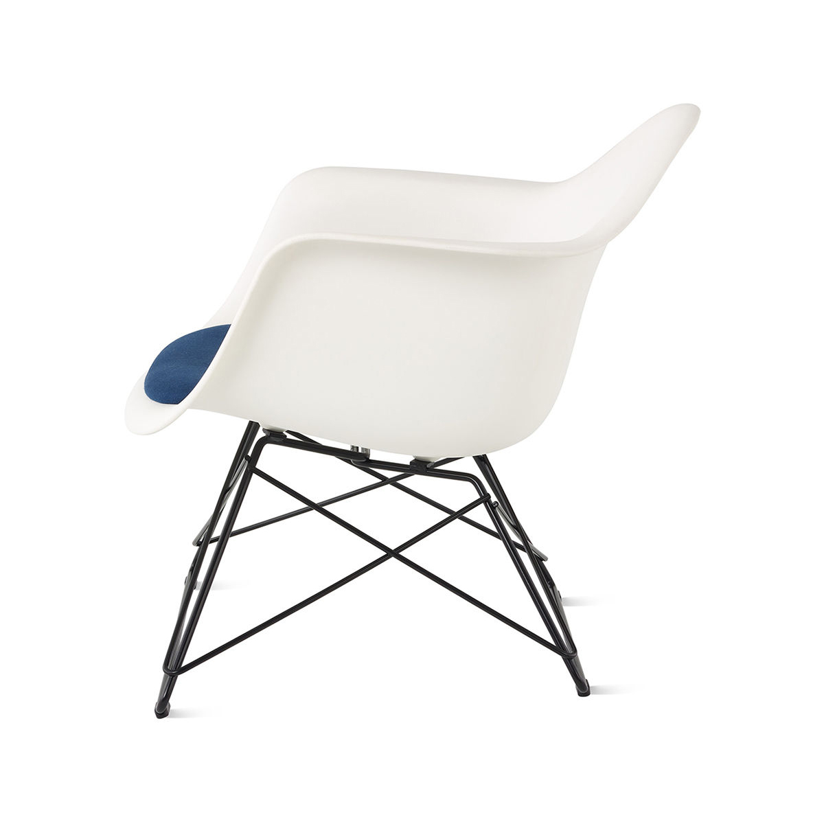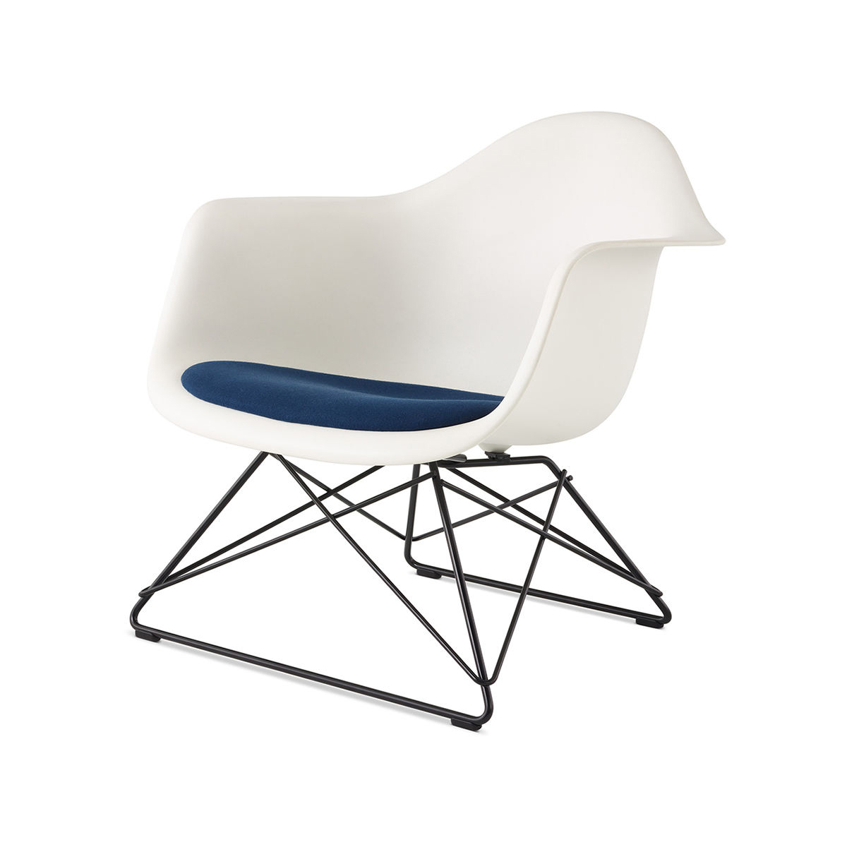 在 MoMA 1948 年國際低成本傢俱設計競賽中,Charles 和 Ray Eames 設計的一體成型椅殼原型獲得獎項,兩年後Herman Miller 推出了 Eames 模壓椅,並提供五種獨特椅腳選擇,其中一種因歷史原因一度失傳的 LAR(Low Armchair Rod Base)底座且發展出「Cat's Cradle(貓咪搖籃)」的暱稱,將這款多用途的一體成型扶手椅轉變為低座休閒椅,至今仍深受收藏家喜愛,現在也重新推出,Eames 低鐵線底座椅可支援所有扶手椅椅殼,並提供布面、非布面或座墊款式。