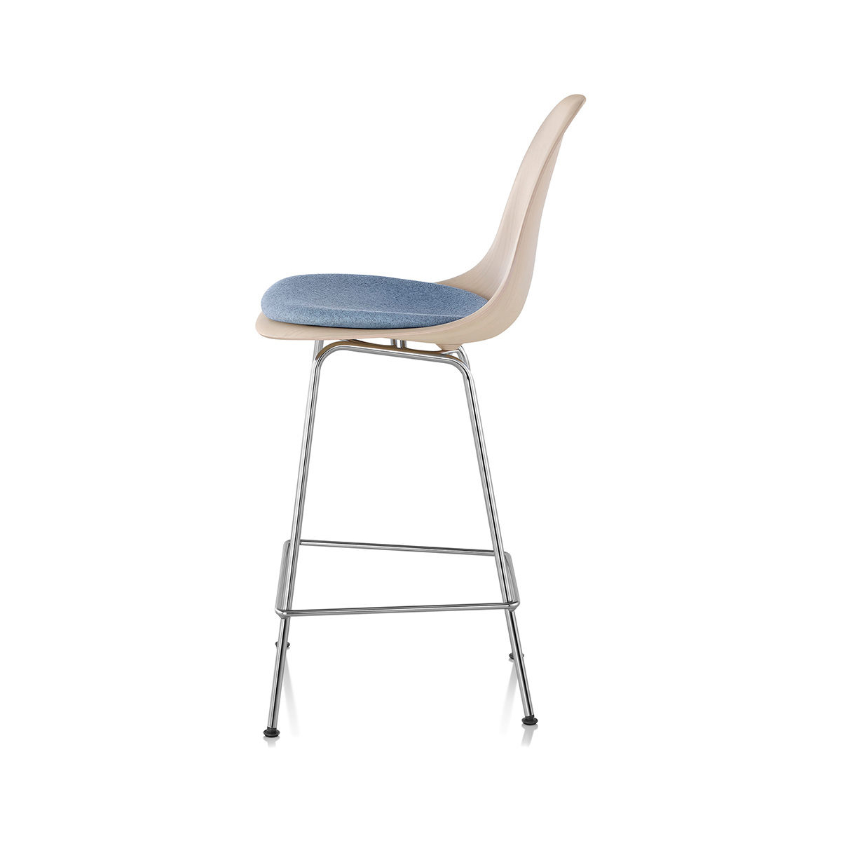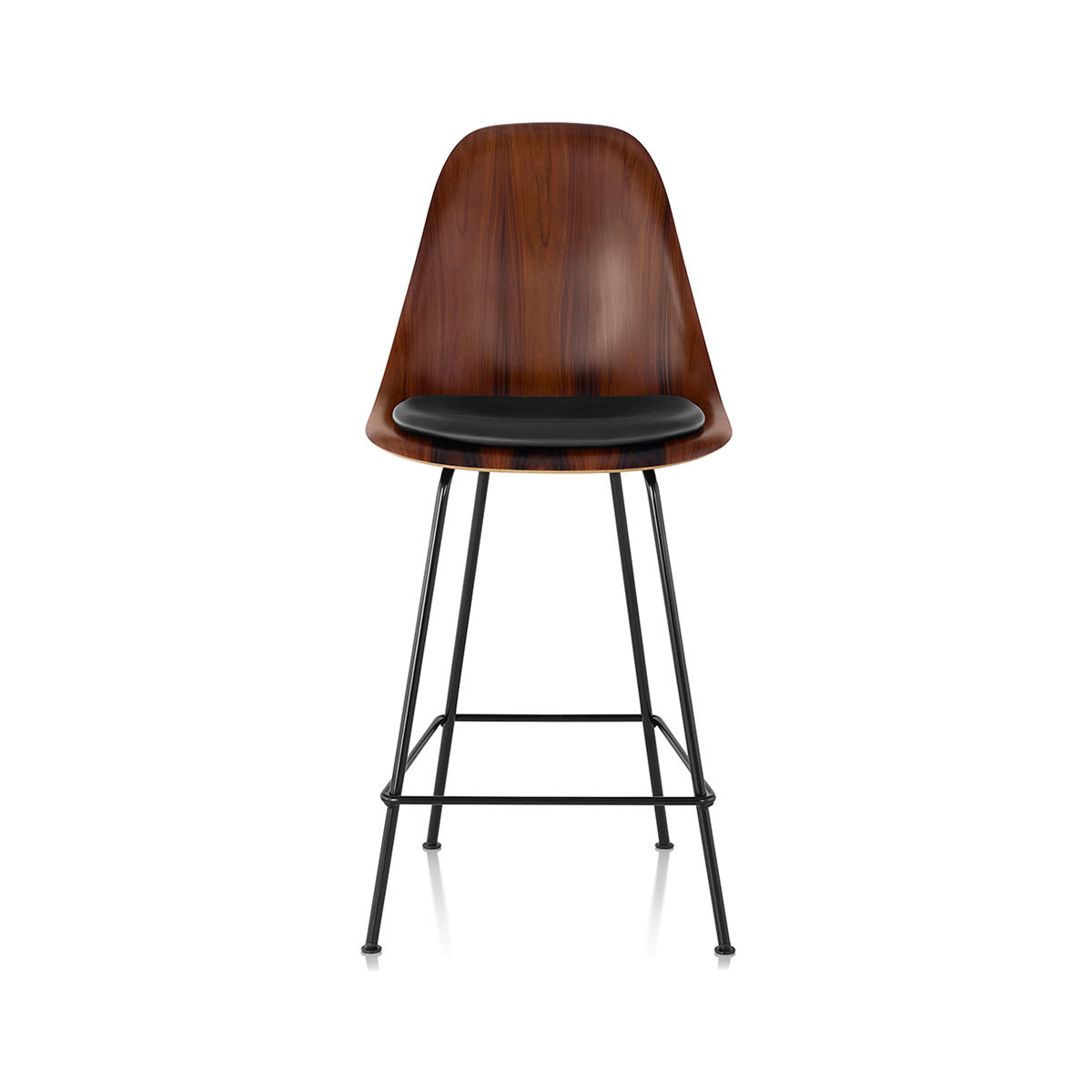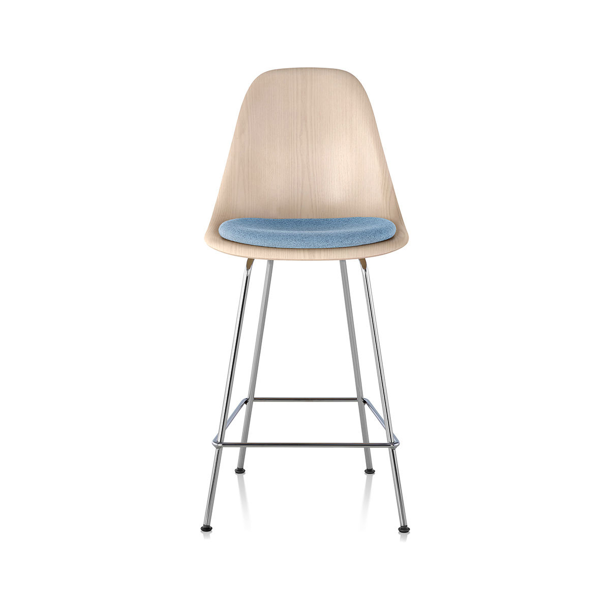 Eames 凳的經典造型,得益於使木貼面額外具柔韌性的製程,使其能成型為單片木殼的複雜曲線,這樣的設計為任何空間增添一抹風格。Eames 模壓木凳提供多種木皮材質選擇。四腳底座可選吧台或中島高度,並提供多種底座飾面。