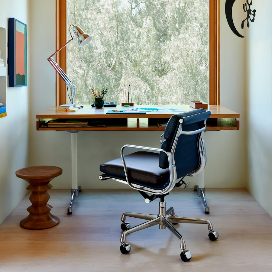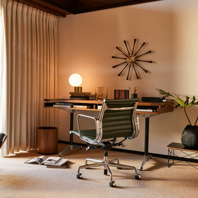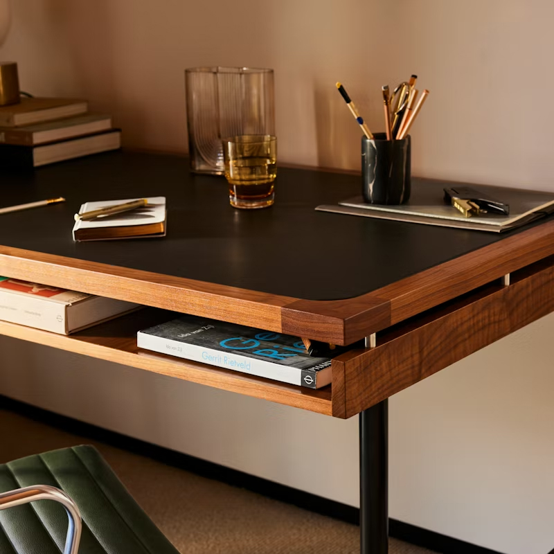 在細節設計上,這款主管桌展現了無與倫比的靈活性與質感。桌面提供兩種尺寸選擇,並可根據個人品味指定為全木飾面或奢華的皮革鑲嵌(Leather inlay),向極致的木工工藝致敬。結構上則重新詮釋了經典的 Eames T 字形桌腳,透過主管級的審美視角,將底座支柱打造為精緻的黑白粉體塗裝,並可選配與支柱一致的塗裝或亮眼的拋光鋁合金椅腳。