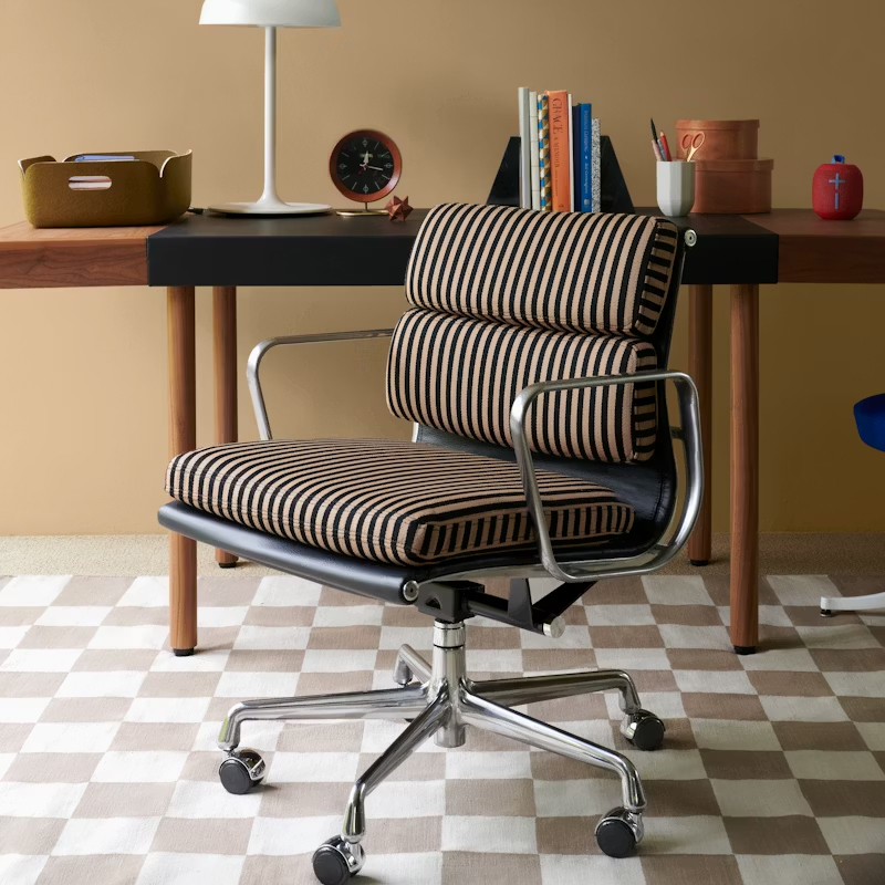 作為 1958 年為 Irwin Miller 住宅設計的 Aluminum Group 鋁製椅系列的延伸,Soft Pad Group 沿用了先前的結構設計,並在座面與椅背上增加了軟墊。這些包覆著皮革或織物的軟墊,將 Aluminum Group 原本俐落簡約的特質,轉化為適用於居家與辦公空間的奢華版本。