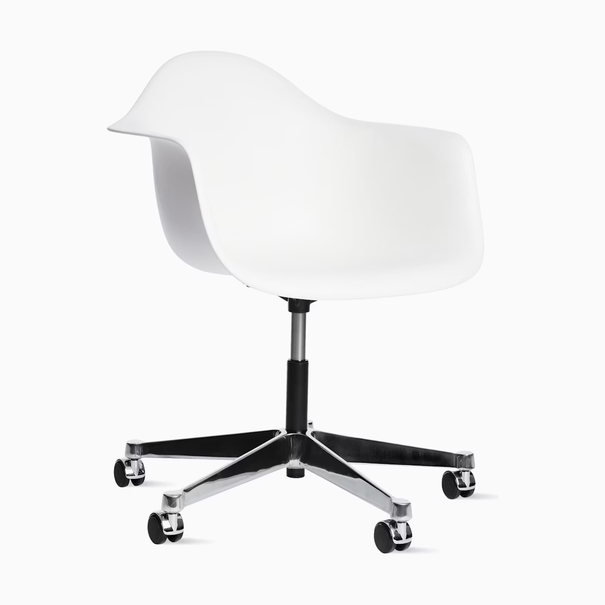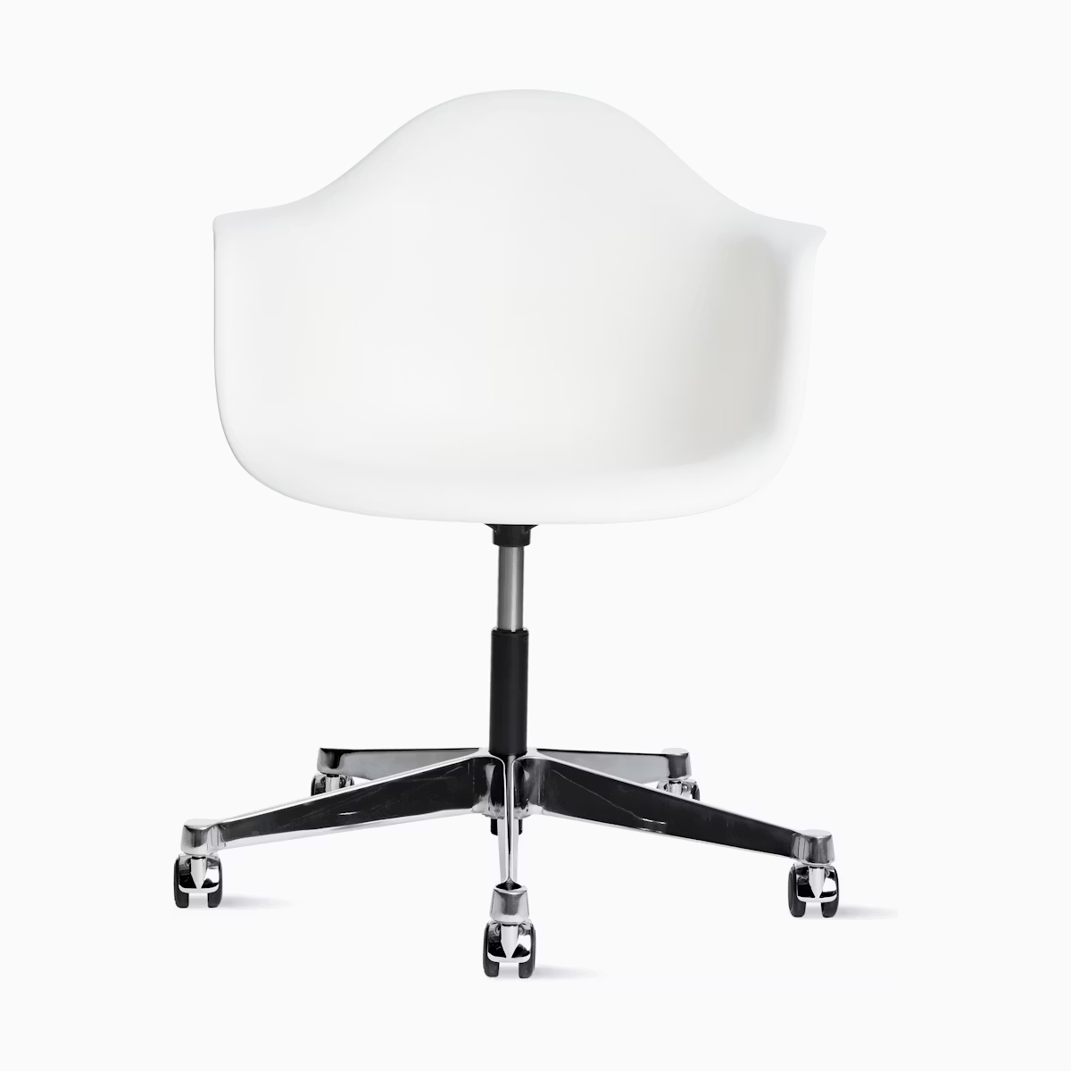 Eames 工作椅配備帶有滑輪的五爪星形底座。氣壓升降功能提供最高 5 英吋的高度調整空間。