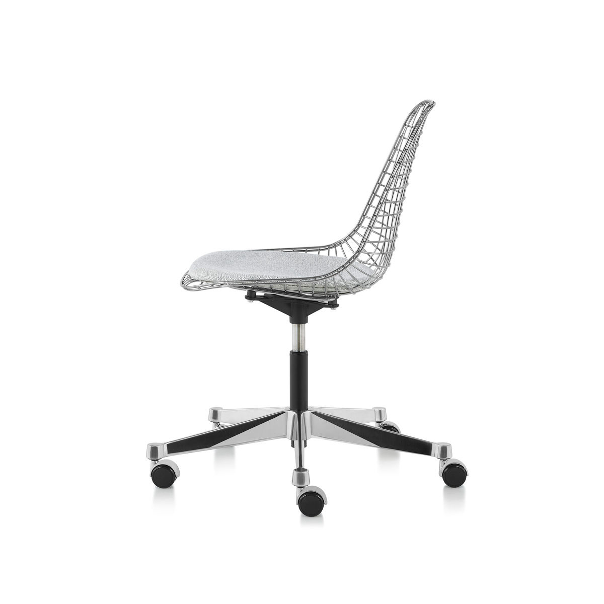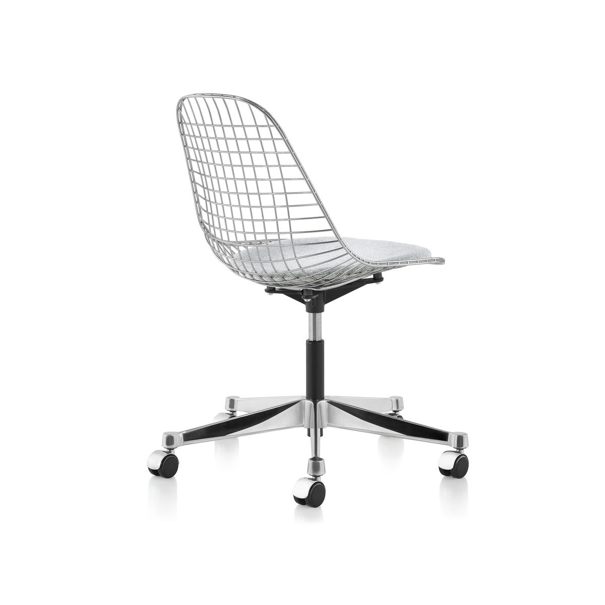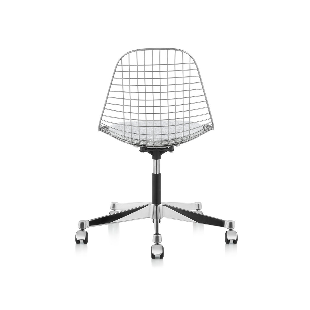 Eames 工作椅配備帶有滑輪的五爪底座,具備最高 5 英吋的氣壓升降調整空間。