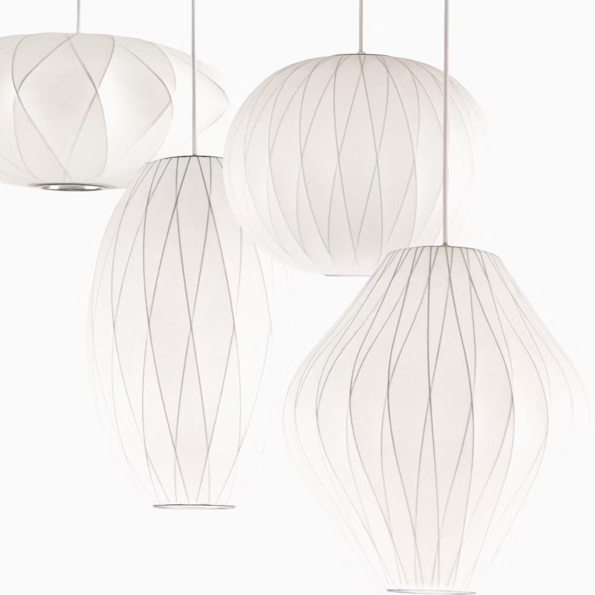 多款不同球形造型的 Nelson Bubble Lamps 由 George Nelson 於 1952 年設計,為室內空間增添柔和光感與輕盈氣息,燈具以堅固輕量的鋼架製成,無論是吊燈、落地燈、桌燈或壁燈版本,都展現優雅漂浮感。