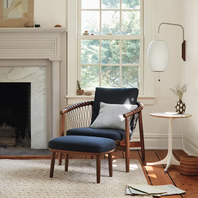 材質:鋼製骨架、自織軟塑膠、實心胡桃木、鍍鎳