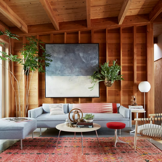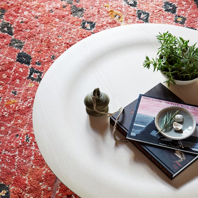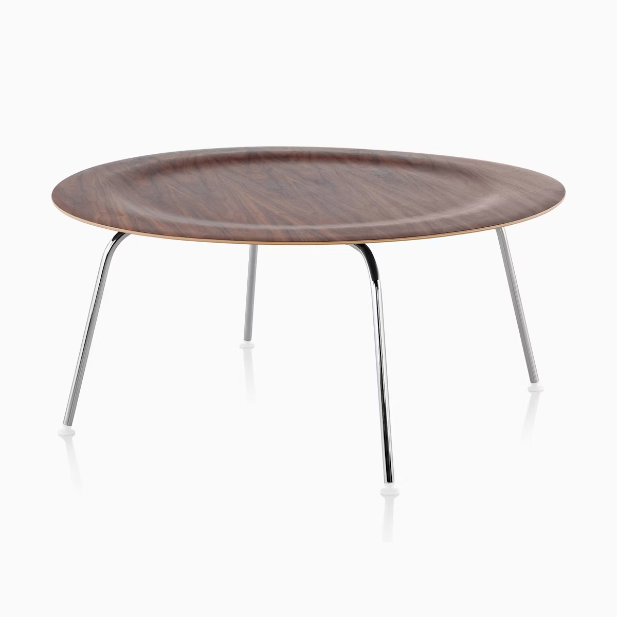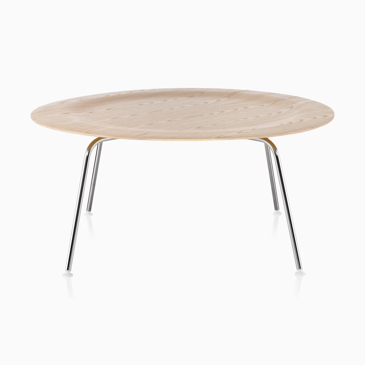 這款經典茶幾的桌面由 薄木皮在高溫與壓力下成型,沿用 Charles 與 Ray Eames 為其成名的 成型膠合木(molded plywood)技術,也正是他們打造成型膠合木椅時的突破工法。成型膠合木金屬腳茶幾外型與實際重量皆輕盈,其略帶凹面的桌面在製程中自然形成柔和邊界,既能避免物品意外滑落,也營造出視覺焦點。