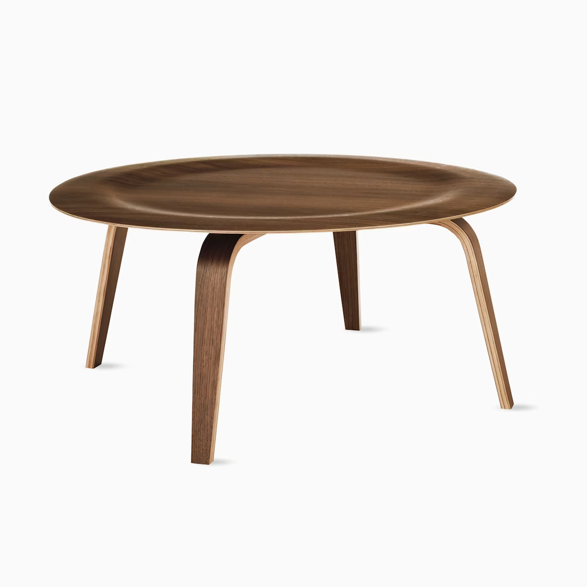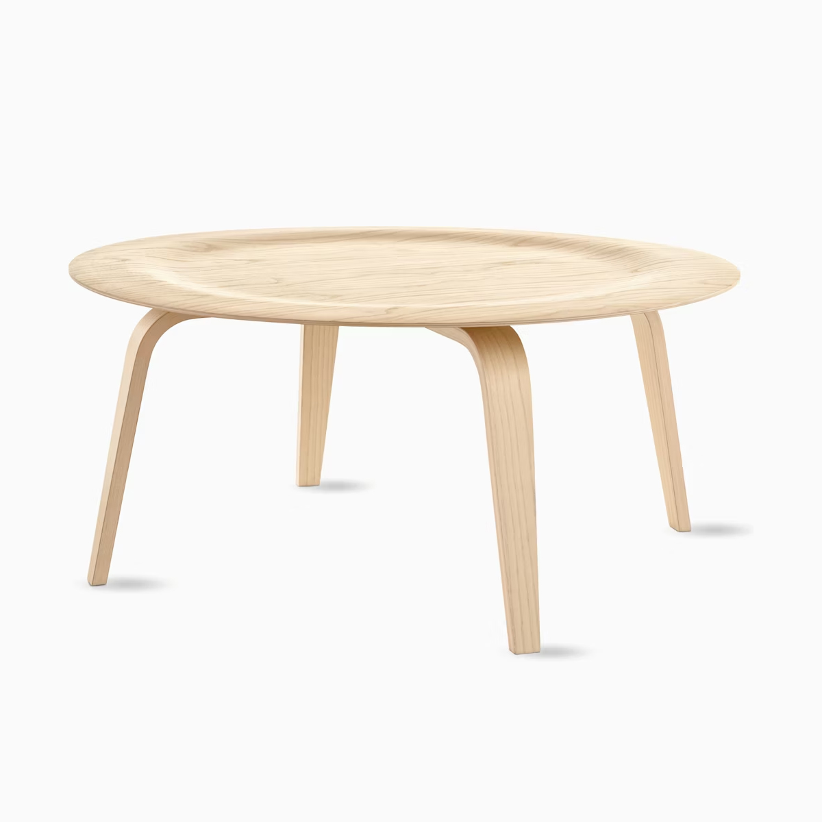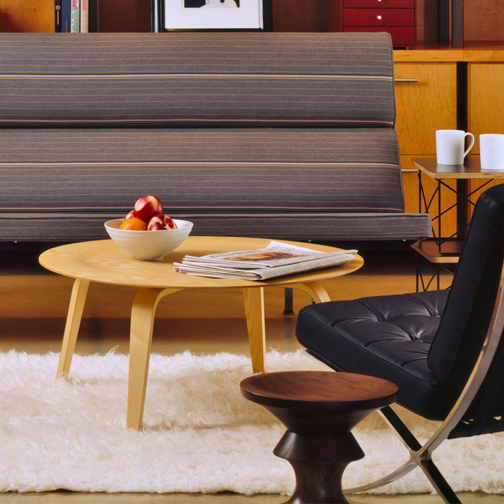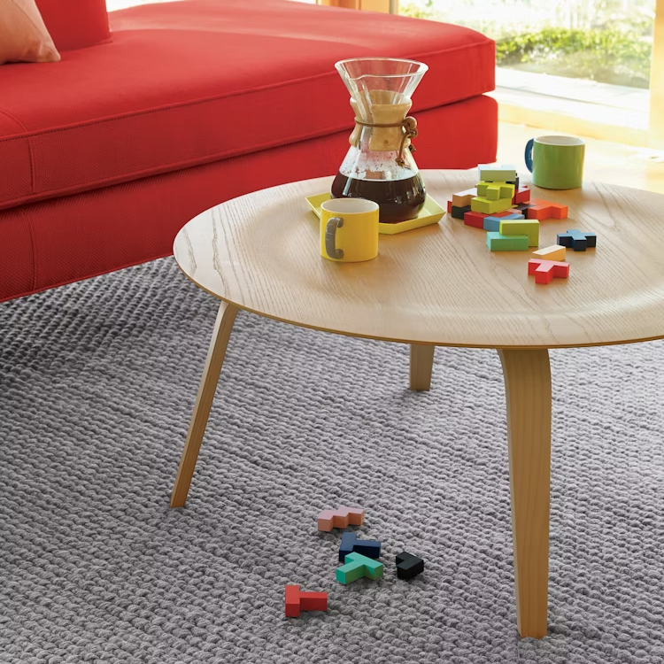 這款經典茶幾的桌面由 薄木皮在高溫與壓力下成型,沿用 Charles 與 Ray Eames 為其成名的 成型膠合木(molded plywood)技術,也正是他們打造成型膠合木椅時的突破工法。