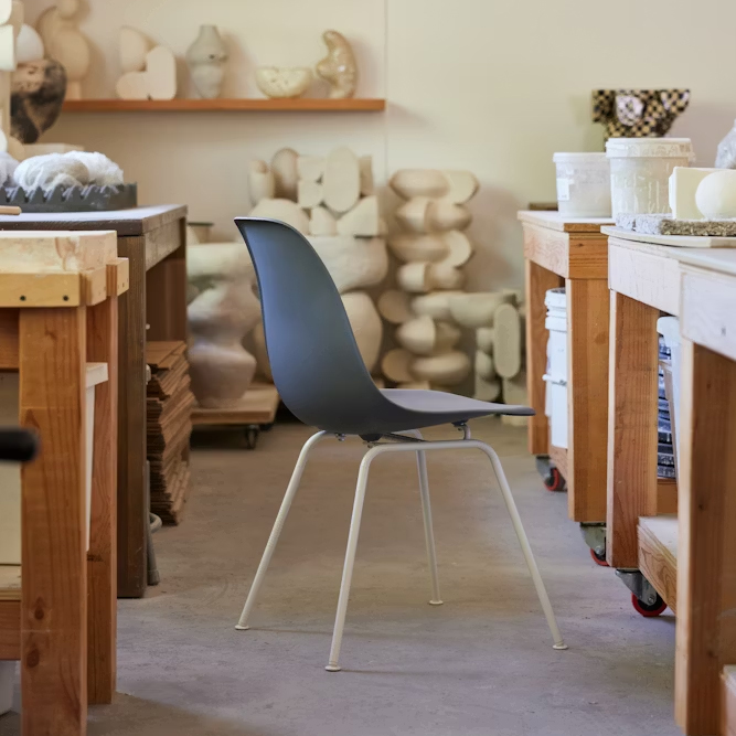 Charles 與 Ray Eames 對 新材料 始終充滿好奇,特別是那些能以 更少材料做更多事 的材料。塑膠正好符合他們的願景,可製作 符合人體曲線的有機椅殼。他們將二戰期間開發的製造技術改良,量產此設計,推出 無扶手與有扶手椅款。Eames 夫婦要求材料表現出 誠實與自然,因此這是 首批無需布面或覆蓋的一體成型塑膠椅。其耐用設計與精良製作,使椅款在各種環境中表現優異。